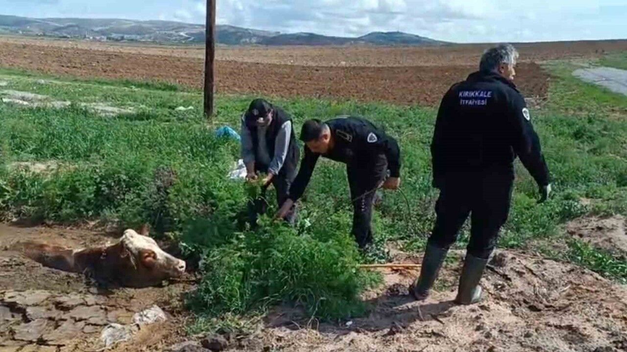 Kırıkkale’de bataklığa saplanan inek, itfaiye ekiplerinin müdahalesiyle kurtarıldı.