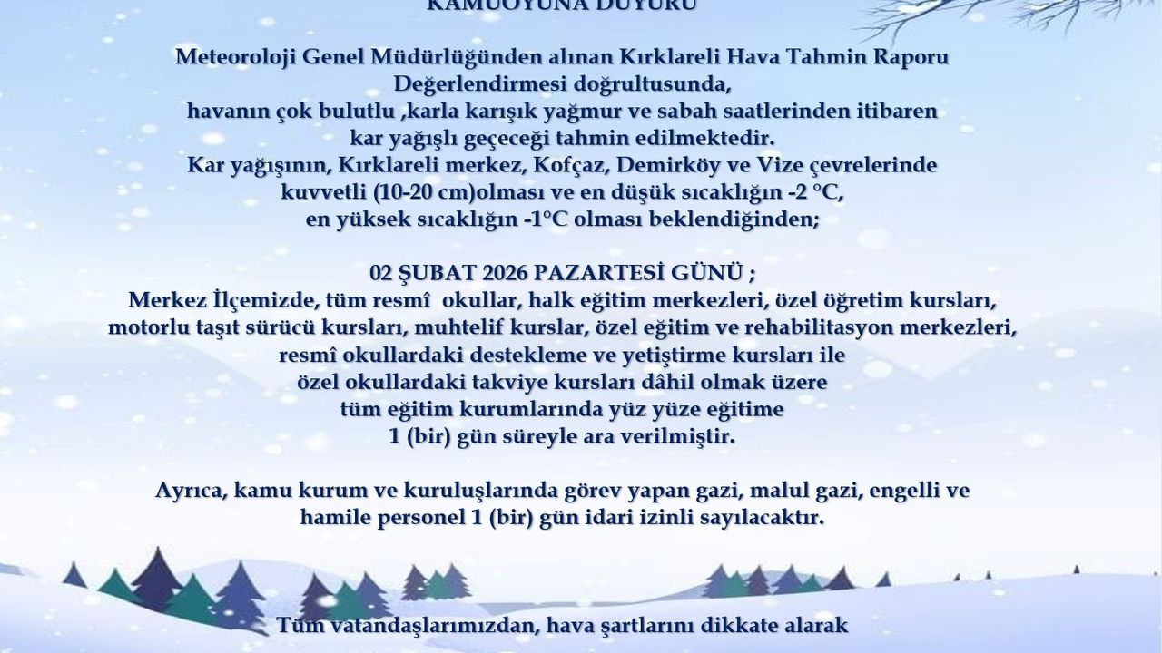 Kırklareli Valiliği tarafından yapılan açıklamada, Meteoroloji Genel Müdürlüğü'nden alınan hava tahmin raporu doğrultusunda, havanın çok bulutlu, karla karışık yağmur ve sabah saatlerinden itibaren kar yağışlı geçmesinin beklendiği bildirildi. Kar yağışının Kırklareli merkez, Kofçaz, Demirköy ve Vize çevrelerinde kuvvetli (10-20 cm) olacağı, sıcaklığın ise en düşük -2, en yüksek -1 derece seviyelerinde seyredeceği beklediğinden Eğitime bir gün ara verirdi.