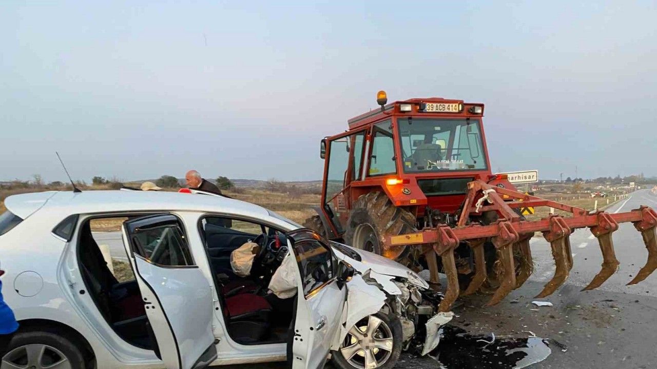 Edinilen bilgilere göre, 59 AKR 575 plakalı otomobil, Pınarhisar Çevre Yolu Erenler köyü kavşağında dönüş yapmak isteyen 39 ACB 414 plakalı traktörle çarpıştı. Traktörün arkasındaki çoklu patlatma tarım aletine çarpan otomobilin ön kısmı tamamen ezilerek, hava yastıkları açıldı ve araç kullanılamaz hale geldi.