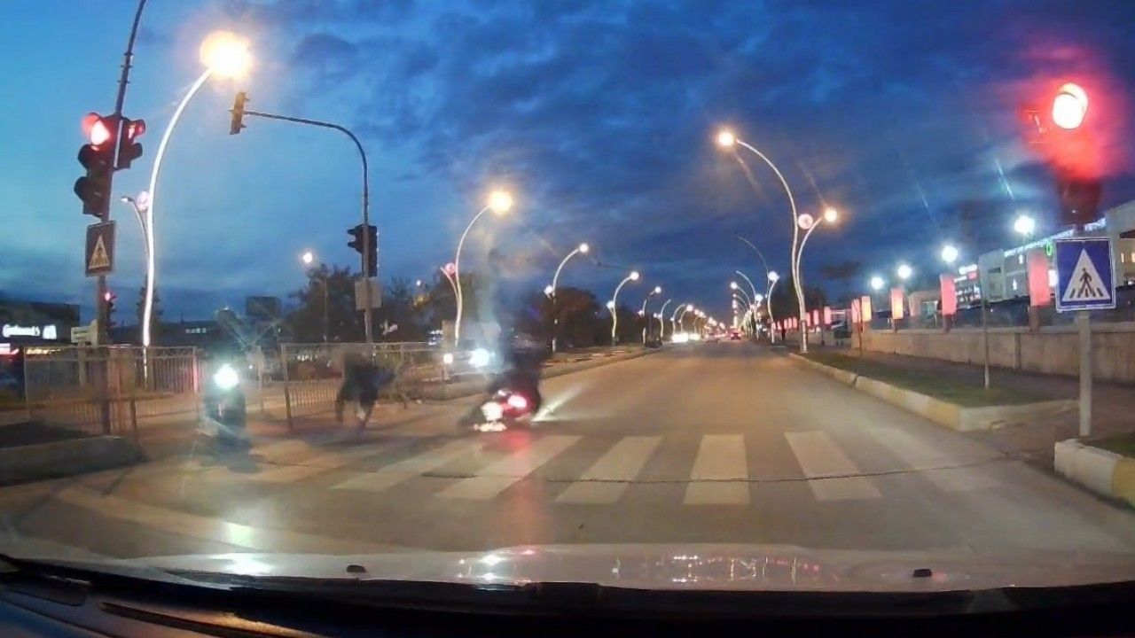 Kaza anı, kavşakta ışıkta bekleyen bir aracın kamerası tarafından kaydedildi. Görüntülerde çarpmanın ardından motosikletli ve yayanın yola savrularak sürüklendiği görüldü.