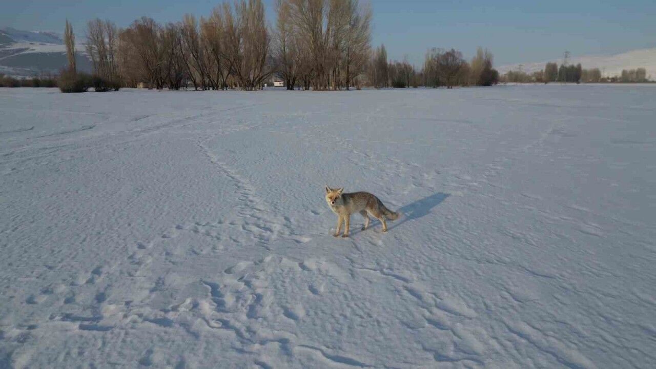 Erzurum’da karlı ovada avlanan Tilki dron ile görüntülendi.