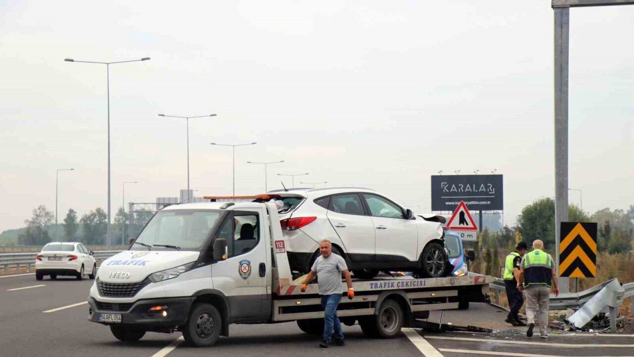 Kuzey Marmara Otoyolu (KMO) Sakarya geçişinde ‘sapağı kaçırıyorum’ paniği akrabaları kazaya sürükledi. Akyazı sapağında kararsız kalarak refüje çarpan cipe, arkasından gelen ve akrabası olduğu öğrenilen hafif ticari araç sürücüsü çarptı. Kazada 2 kişi yaralandı.