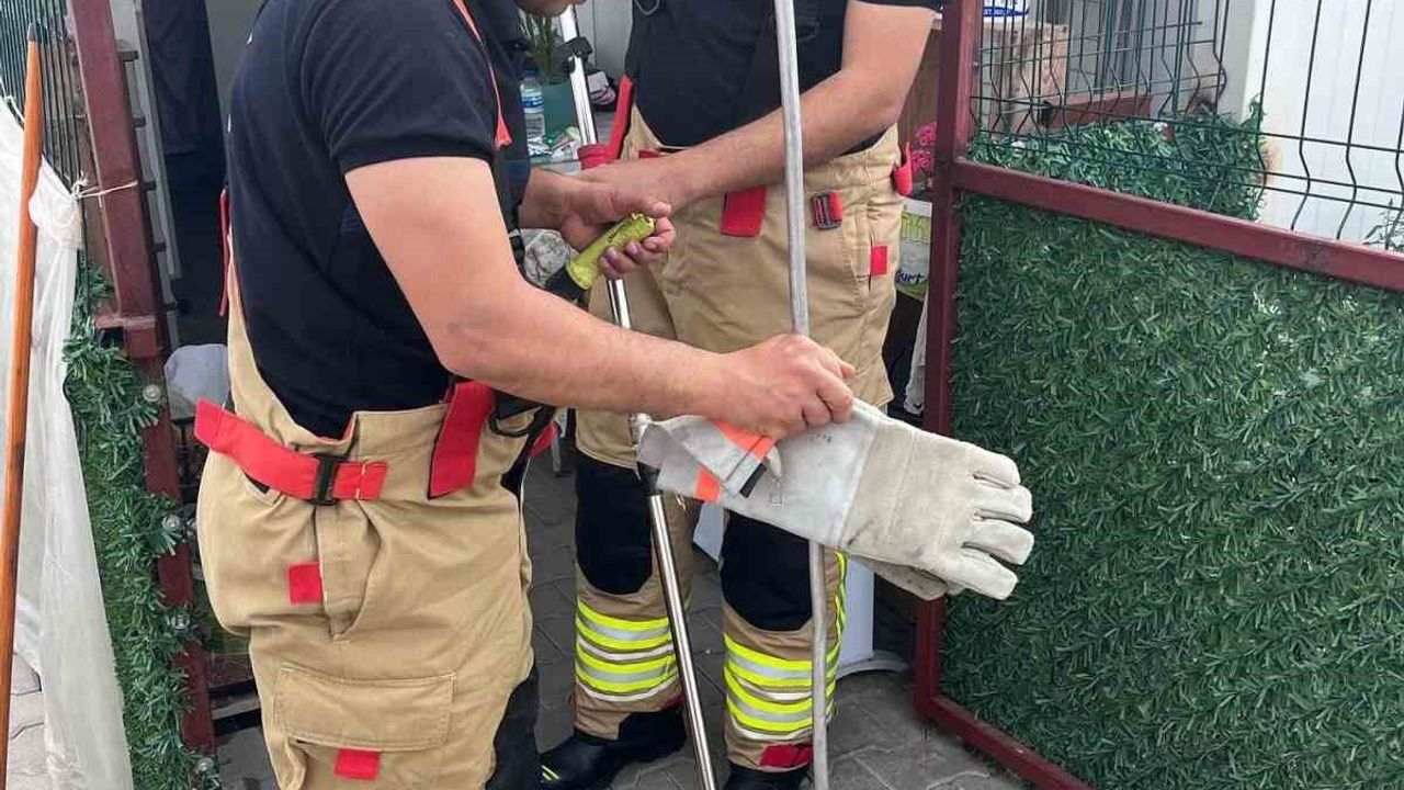 Hatay’da depremzede vatandaşların yaşadığı konteynere giren yılanı itfaiye yakaladı.