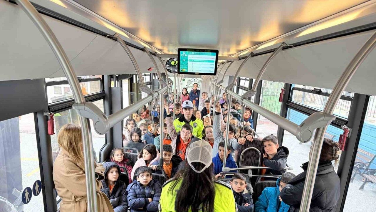"Trafikte Nezaket ve Görgü Kuralları Projesi" kapsamında hayata geçirilen çalışmayla toplu ulaşımda kullanılmakta olan bir otobüs ile okullara gidilerek, otobüs içerisinde toplu ulaşımda nezaket ve görgü kuralları hakkında öğrencilere bilgilendirmeler yapılıyor. Eğitime katılan öğrenciler durakta beklerken, toplu ulaşım araçlarına binerken ve araç içerisinde yolculuk yaparken dikkat etmeleri gereken konular hakkında bilgi sahibi oluyor.