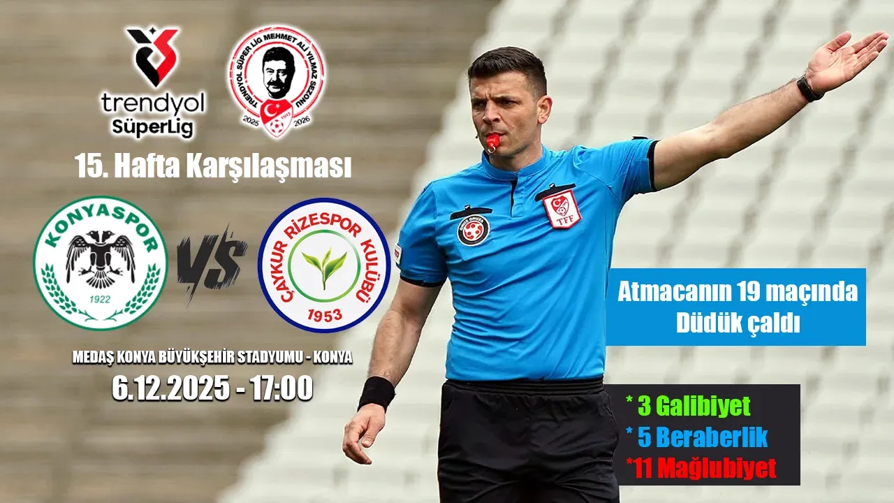 6 Aralık Cumartesi günü saat 17:00'de MEDAŞ Konya Büyükşehir Stadyumunda oynanacak olan TÜMOSAN Konyaspor Çaykur Rizespor maçını Ümit Öztürk yönetecek. Öztürk'ün yardımcılıklarını ise Murat Temel ve Suat Güz yapacak. Öztürk bu sezon Çaykur Rizespor'un deplasmanda 1-1 berabere kaldığı Kocaelispor maçını yönetmişti. Yeşil Mavili ekip Ümit Öztürk'ün yönettiği 19 karşılaşmada 3 galibiyet, 5 beraberlik elde ederken 11 maçtan ise sahadan mağlup ayrıldı. Kayserispor ise Öztürk'ün yönettiği 23 maçın 7'sinde galip gelmiş, 3'ünde berabere kalmış 13 maçta ise mağlup olmuş.