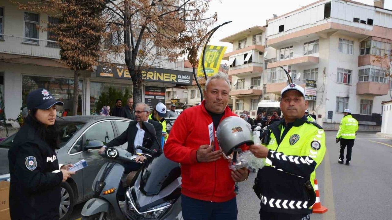 Korkuteli ilçesinde polis ekipleri tarafından motosiklet sürücülerine ücretsiz kask dağıtıldı.