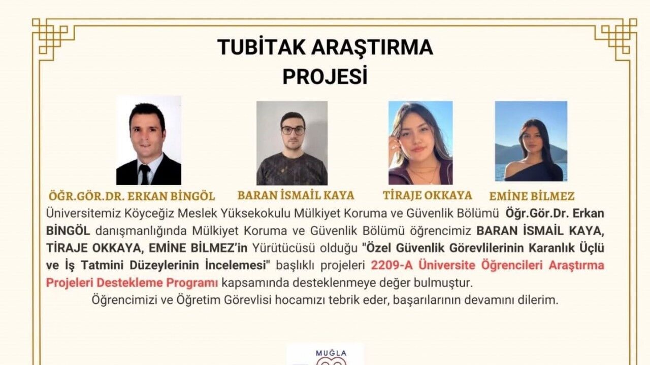 Muğla Sıtkı Koçman Üniversitesi Köyceğiz Meslek Yüksek Okulu Mülkiyet Koruma ve Güvenlik Bölümü Öğr. Gör. Dr. Erkan Bingöl danışmanlığında Mülkiyet Koruma ve Güvenlik Bölümü öğrencisi Baran İsmail Kaya, Tiraje Okkaya, Emine Bilmez’in yürütücüsü olduğu "Özel Güvenlik Görevlilerinin Karanlık Üçlü ve İş Tatmini Düzeylerinin İncelenmesi" başlıklı projeleri 2209-A Üniversite Öğrencileri Araştırma Projeleri Destekleme Programı kapsamında desteklenmeye değer bulundu. Meslek Yüksek Okulu Müdürlüğü tarafından yapılan açıklamada; "Yüksekokulumuz bünyesinde görev yapan Öğr. Gör. Dr. Erkan Bingöl danışmanlığında, öğrencilerimiz Baran İsmail Kaya, Tiraje Okkaya ve Emine Bilmez’e başarılar diler, özverili çalışmalarının devamını dileriz." ifadeleri kullanıldı.