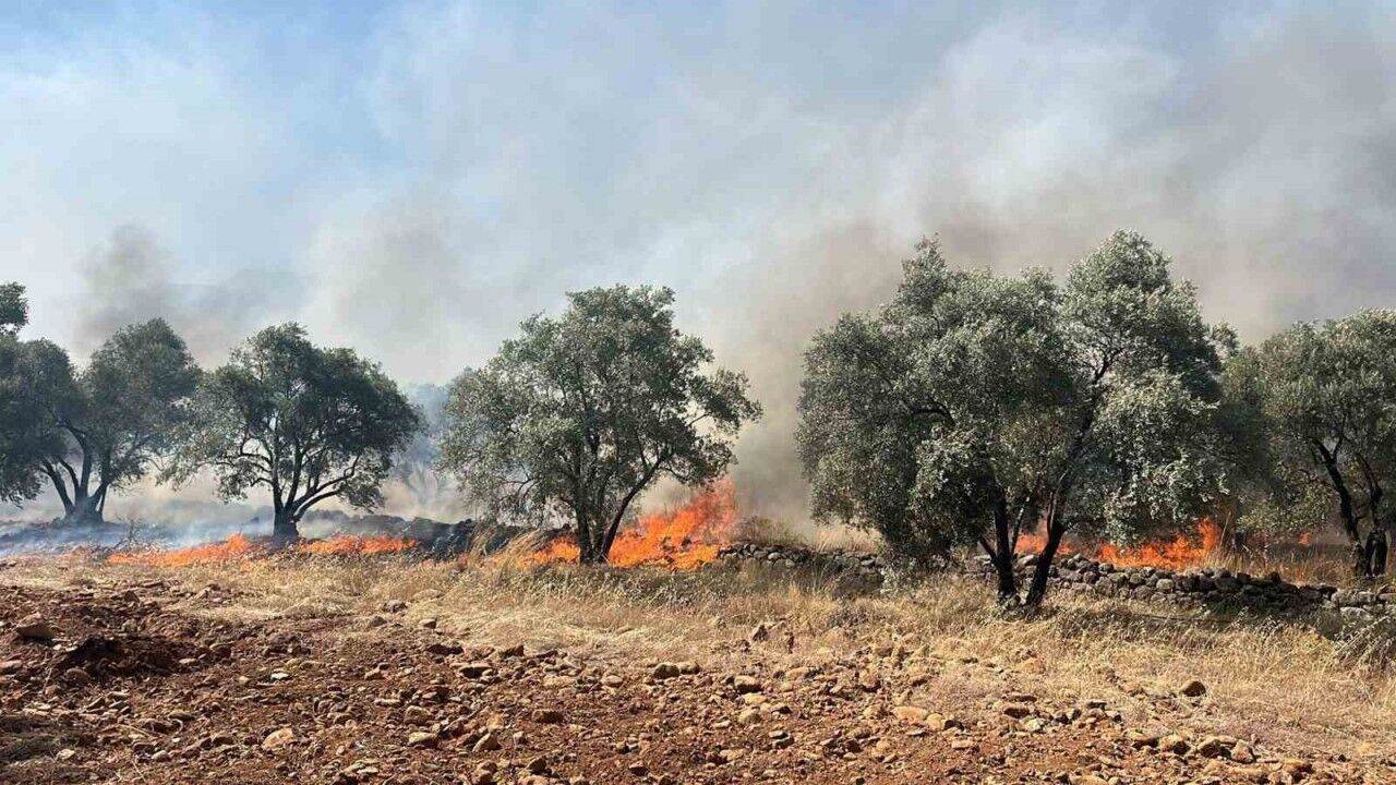 Zeytinlik alanda başlayan yangına yer ekiplerinin müdahalesi sürerken bölgede rüzgarın etkili olduğu öğrenildi.