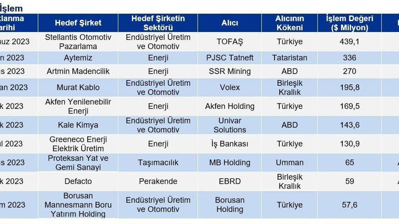 Açıklanan bilgilere göre; 2023 yılında Türkiye’deki birleşme ve satın alma işlemlerinin genel görünümü Kasım ayı sonu itibarıyla toplam işlem adedi bazında geçen yılın ilk 11 ayında 205 olurken bu yıl aynı dönemde 486’ye ulaştı. Açıklanan işlem hacmi 2,7 milyar dolar ile geçen yılın altında kalmış olsa da değeri açıklanmayan işlemlerin şirket tarafından yapılan tahminler ve değerlendirmeler sonucunda 7,3 milyar dolara ulaştığı ve böylece geçen seneyi de geride bıraktığı tahmin ediliyor.