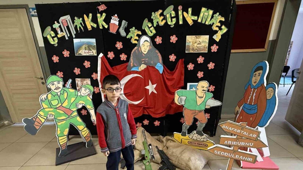 Seyit Onbaşı’nın kahramanlığından etkilenen 8 yaşındaki öğrenci, okul köşesindeki maketine selam vererek izleyenleri duygulandırdı.