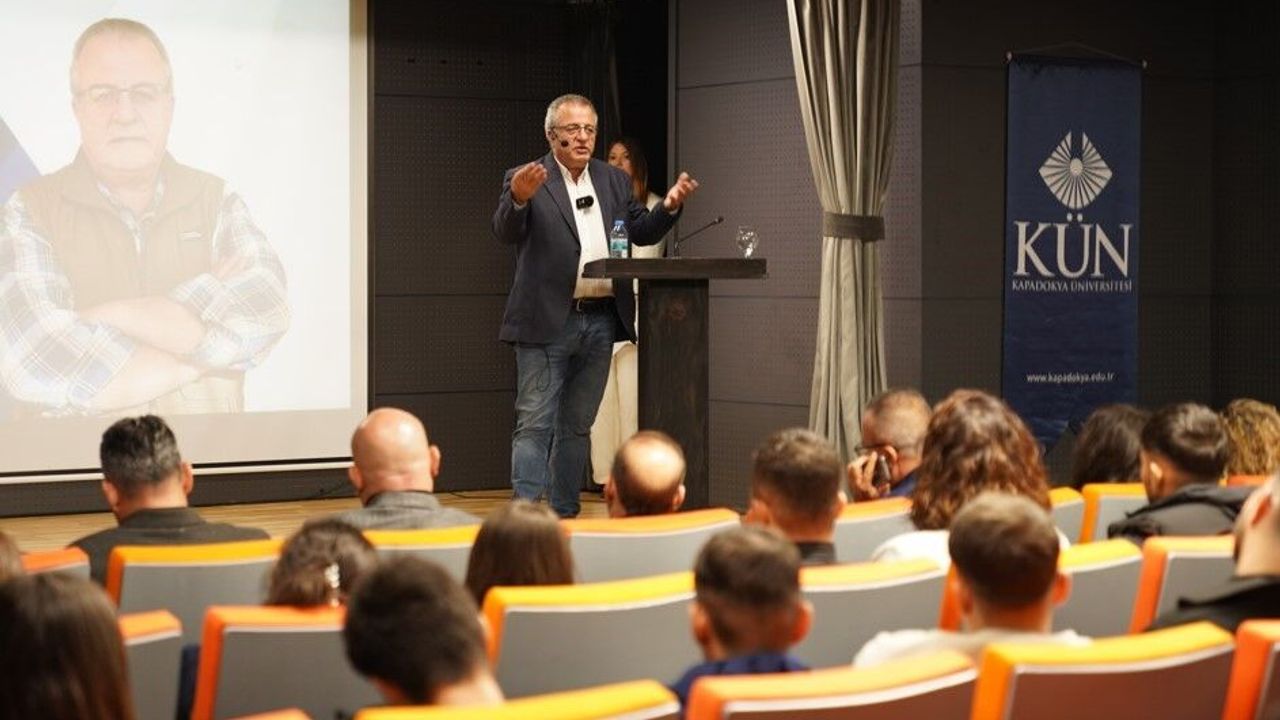 Kapadokya Üniversitesinin tüm mensuplarına verimli ve hayırlı bir 2023-2024 akademik yılı dileyen Prof. Dr. Candan Gökçeoğlu, KÜN açılış dersinde öğrencilerle bir arada bulunmaktan duyduğu memnuniyeti ifade etti. Açılış dersine güneş sistemimizin oluşması ve dünyamızın günümüze kadar gelen sürede yaşadığı değişimleri anlatarak başlayan Gökçeoğlu, “Anadolu olarak Dünya’nın en aktif sismik zonlarından birinin ortasındayız. Bu kötü bir şey mi? Bana göre asla değil. Anadolu’nun bütün güzellikleri, dereleri, tepeleri, dağları, ovaları, suları ve verimli toprakları tamamen bu kuşağın ürünüdür.” dedi. Gökçeoğlu, “Kapadokya’daki volkanik faaliyetler 13 milyon yıl öncesine kadar gidiyor. Volkanlar 13 milyon yıldır zaman zaman bir yerlerden püskürüyor, bir yere çöküyor ve orada bir kaya grubu oluşuyor. Bir gaz ve su püskürtüyor, arkasından kül püskürtüyor. Arkasından bu tüfler ufak kaya parçalarıyla birlikte volkanik bomba püskürüyor. En sonda da lav geliyor, işte o püsküren tüfler gördüğümüz peribacalarını oluşturan bazalt, andezit gibi isimlerle ifade ettiğimiz kayalar.” olduğunu belirterek Kapadokya’nın oluşumunu anlattı. Son olarak depremlerden korunmak için alınması gereken önlemleri ifade eden Gökçeoğlu, depreme dayanıklı binalar inşa etmenin önemini vurguladı.