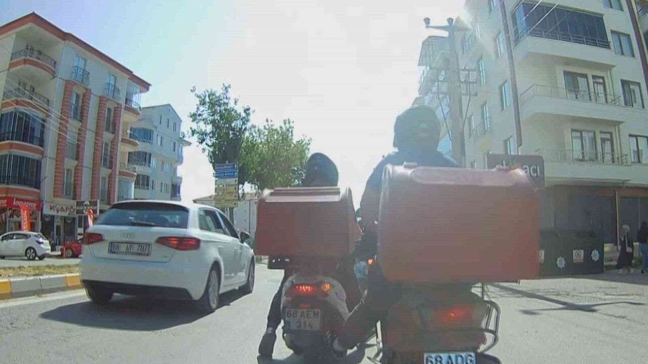 Aksaray’da motosikleti arızalanan kurye, bir başka kurye arkadaşı tarafından motosikleti ayağıyla itmek sureti ile trafikte seyretti. İki motosikletli kuryenin tehlikeli yolculuğu kameraya yansırken, yolculuk kilometrelerce sürdü.