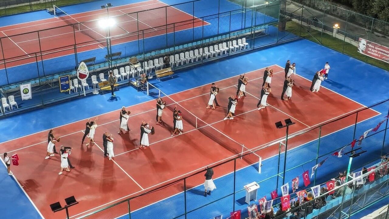 Gecede Kuşadası Kent Konseyi Cumhuriyet Sevdalıları Grubu, Atatürk’ün izinde hazırladıkları vals ve zeybek gösterileriyle sahne aldı. Cumhuriyet’in ruhunu en zarif biçimde yansıtan bu performans, izleyenlere unutulmaz anlar yaşattı. Ardından kortlara meşaleler eşliğinde çıkan tenisçiler, Cumhuriyet meşalesini simgeleyen görkemli bir kortej oluşturdu.