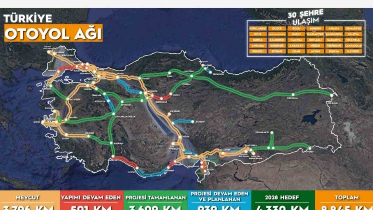 Ulaştırma ve Altyapı Bakanlığı tarafından yayımlanan güncel "Türkiye Otoyol Ağı" haritası, Batı Anadolu’nun en kritik ulaşım koridorlarından biri olan Bozüyük-Kütahya-Afyonkarahisar hattının stratejik önemini bir kez daha ortaya koydu. Haritada, özellikle Kütahya’nın Türkiye’nin kuzey-güney ve doğu-batı yönlü trafik akışının kesişim noktası hâline geldiği dikkat çekiyor.
