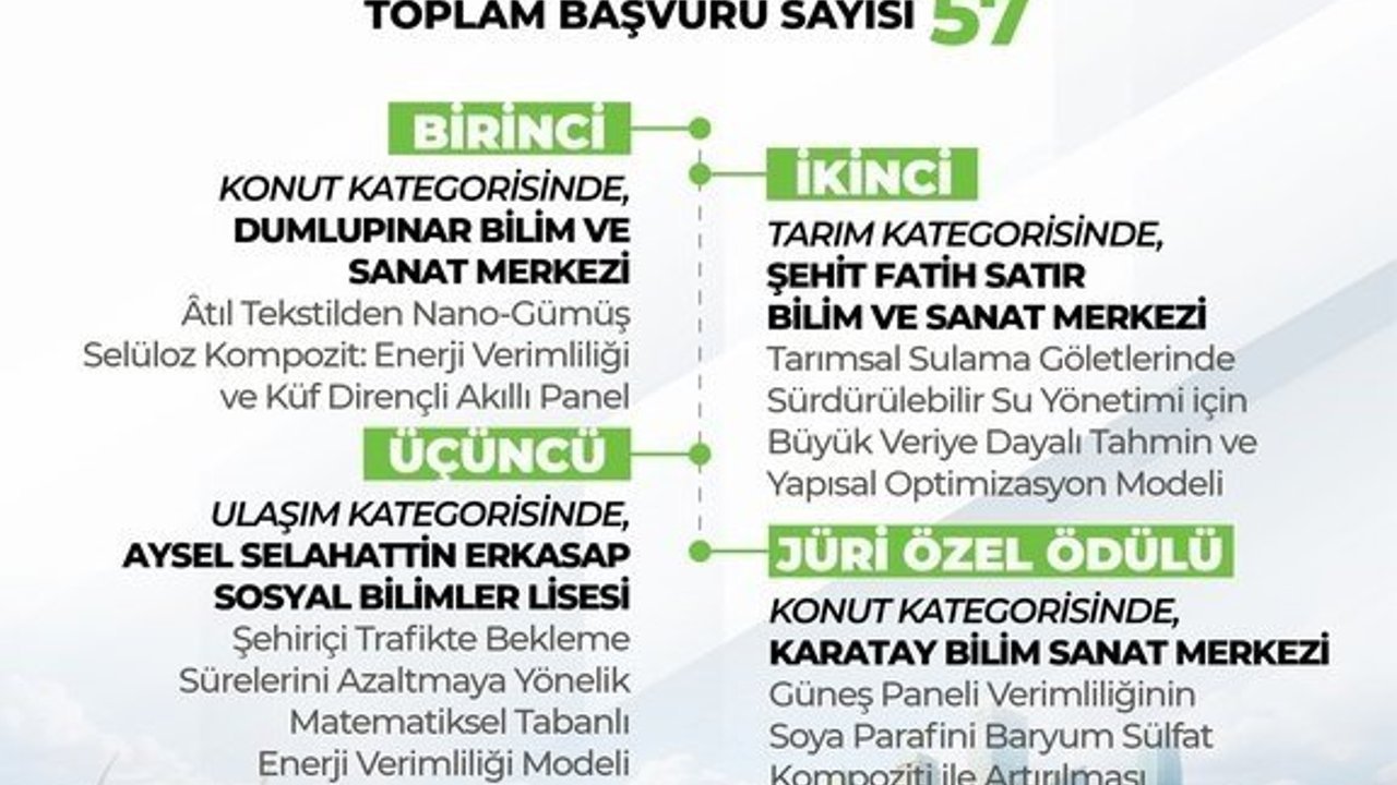 Yarışmada dereceye giren projelerden, 'Atıl Tekstilden Nano-Gümüş Selüloz Kompozit: Enerji Verimliliği ve Küf Dirençli Akıllı Panel' birincilik ödülüne layık görülürken, 'Tarımsal Sulama Göletlerinde Sürdürülebilir Su Yönetimi için Büyük Veriye Dayalı Tahmin ve Yapısal Optimizasyon Modeli' ikinci, 'Şehiriçi Trafikte Bekleme Sürelerini Azaltmaya Yönelik Matematiksel Tabanlı Enerji Verimliliği Modeli' ise üçüncü oldu. 'Güneş Paneli Verimliliğinin Soya Parafini Baryum Sülfat Kompoziti ile Artırılması' adlı proje de jüri özel ödülünü kazandı.