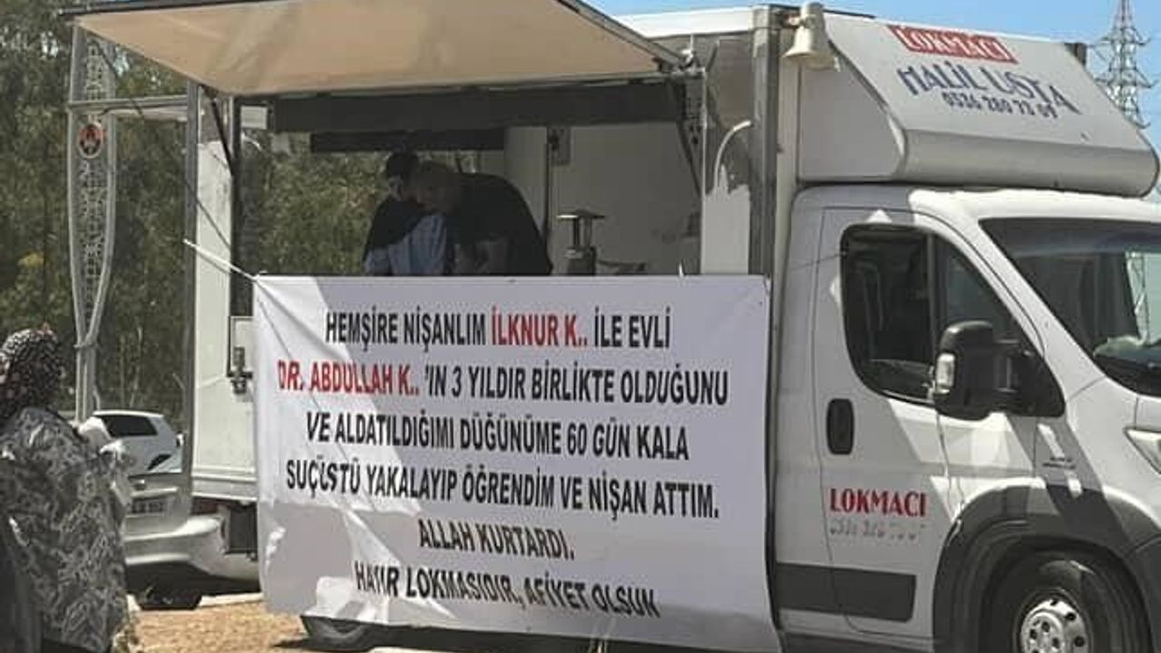 Adana’da düğününe 60 gün kala nişanlısı hemşire İlknur K.’nin, evli bir doktor olan Abdullah K. ile yaklaşık 3 yıldır gizli bir ilişki yürüttüğünü öğrenen genç adam, nişanı bozdu. Daha sonra bir tatlıcı ile anlaşan kişi, hemşire ve doktorun görev yaptığı Adana Şehir Eğitim ve Araştırma Hastanesi önünde lokma dağıttı. Araç önüne yerleştirdiği pankartta ise "Aldatıldığımı düğünüme 60 gün kala suçüstü yakalayıp öğrendim ve Allah kurtardı. Hayır lokmasıdır, afiyet olsun" ifadelerine yer verdi. Lokma yiyip yazıyı okuyanlar hayrete düştü.