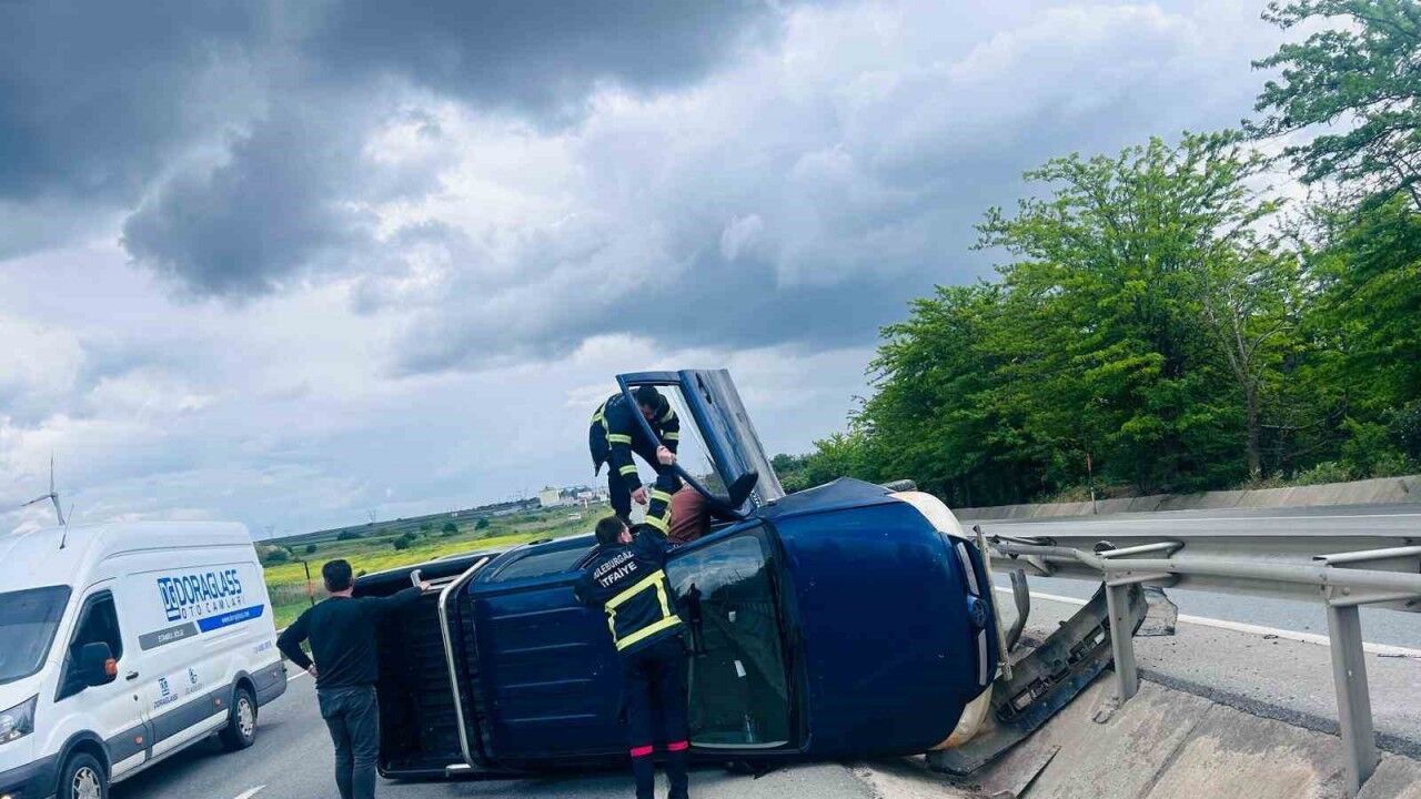 Kırklareli’nin Lüleburgaz ilçesinde sürücüsünün kontrolünden çıkan otomobil, bariyerlere çarparak devrildi.