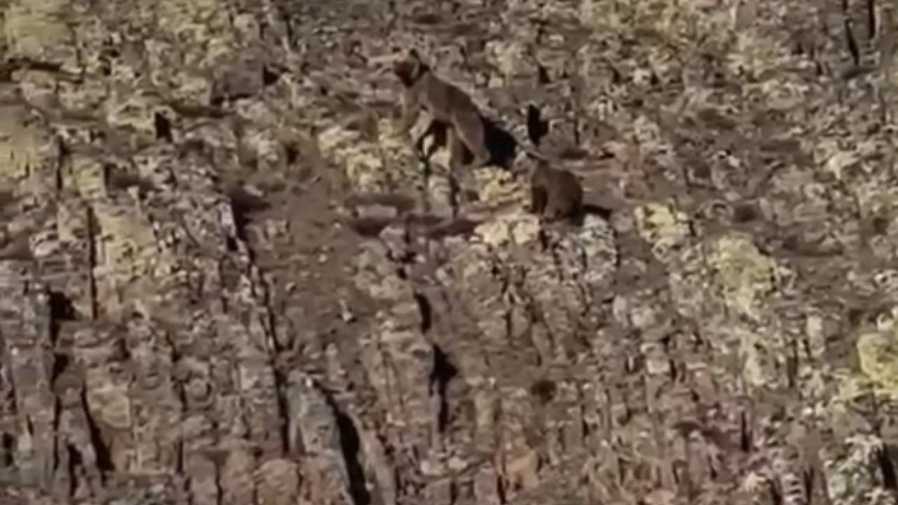 Vatandaşları fark eden anne ayı ve yavrusu bir süre sonra dağın zirvesine doğru ilerleyerek gözden kayboldu.