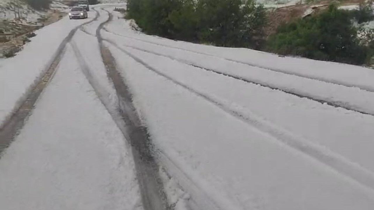 Malatya’nın Hekimhan ilçesinde etkili olan dolu yağışı sonra ilçe beyaza bürünürken, ulaşımda zorluklar yaşandı çok sayıda araç yolda kaldı.