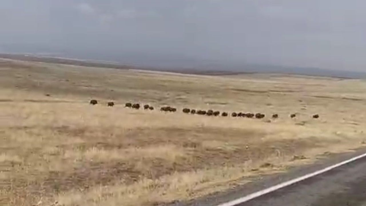 Muş’un Malazgirt ilçesinde büyük bir yaban domuzu sürüsü görüntülendi.