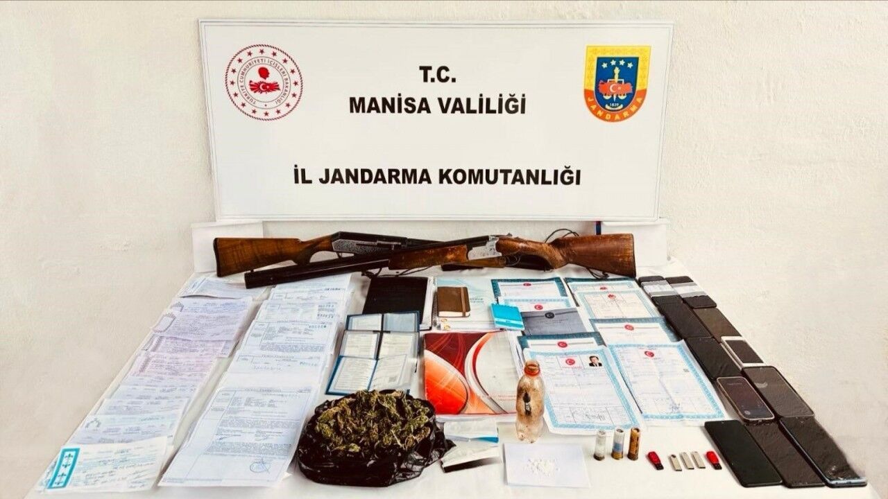 Şüphelilerin yakalanması ve suç unsurlarının ele geçirilmesi amacıyla bugün düzenlenen operasyona Manisa İl Jandarma Komutanlığı KOM ve İstihbarat Şube Müdürlüğü ile Alaşehir, Sarıgöl ve Akhisar İlçe Jandarma Komutanlıklarından toplam 133 personel katıldı. Alaşehir, Sarıgöl ve Akhisar ilçelerinde 12 şüpheliye ait 12 adres ile 2 araçta gerçekleştirilen aramalarda 30 adet senet (toplam 3 milyon 622 bin 150 TL), 124 adet boş senet, 2 adet çek (toplam 560 bin TL), 25 adet araç satış sözleşmesi, 3 adet araç ruhsatı, 11 adet tapu, 3 adet ihbarname, 2 sayfa alacak-verecek belgesi, 26 gram uyuşturucu madde, 2 adet av tüfeği, 18 adet cep telefonu, 6 adet ajanda ve 4 adet harici bellek ele geçirildi.
