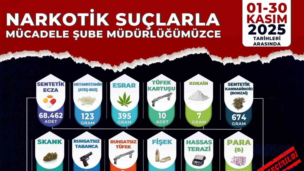 Manisa İl Emniyet Müdürlüğü Narkotik Suçlarla Mücadele Şube Müdürlüğü koordinesinde, Akhisar, Alaşehir, Salihli, Soma ve Turgutlu Narkotik Suçlarla Mücadele Büro Amirliklerinin desteğiyle 1-30 Kasım 2025 tarihleri arasında yürütülen çalışmalar sonucunda 387 olay meydana gelirken, 454 şüpheli yakalandı. Şüphelilerden 54’ü tutuklanırken, 106 aranan şahıs da yakalandı. Yapılan operasyonlarda; 68 bin 492 sentetik ecza (hap), 503 gram sentetik kannabinoid (bonzai), 395 gram esrar, 171 gram sentetik kannabinoid (bonzai) hammaddesi, 123 gram metamfetamin, 76 gram skank, 7 gram kokain, 2 ruhsatsız tabanca, 13 fişek, 1 ruhsatsız tüfek, 10 tüfek kartuşu, 2 hassas terazi ve uyuşturucu madde ticaretinden elde edildiği değerlendirilen 331 bin 410 TL para ele geçirildi.