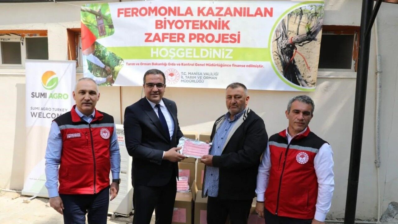 Manisa’da dünyaca ünlü Sultani çekirdeksiz üzümünün yetiştirildiği başta Sarıgöl ilçesi olmak üzere Gölmarmara, Salihli, Şehzadeler ve Yunusemre ilçesindeki çiftçilere hem çevre hem de insan sağlığını gözeten modern mücadele yöntemlerinin yaygınlaştırılması ve desteklenmesi için üzüm üreticilerine feromon tuzağı dağıtıldı. "Feromonla Kazanılan Biyoteknik Zafer Projesi" kapsamında toplam 5 bin 333 dekar alanda biyoteknik mücadele uygulaması gerçekleştirilerek 160 bin adet feromon tuzağı yüzde 50 hibe desteğiyle üreticilere teslim edileceği ifade edildi.
