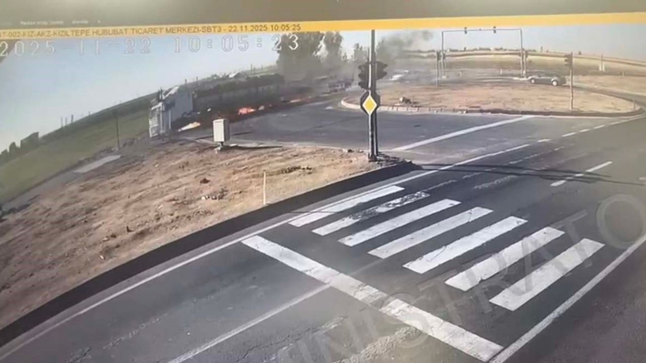 Mardin’in Kızıltepe ilçesinde 2 tır ile SUV tipi aracın çarpıştığı kaza sonrası alev alan bir tırda çıkan yangın itfaiye ekiplerinin müdahalesiyle söndürüldü. O anlar güvenlik kamerasına anbean yansıdı.