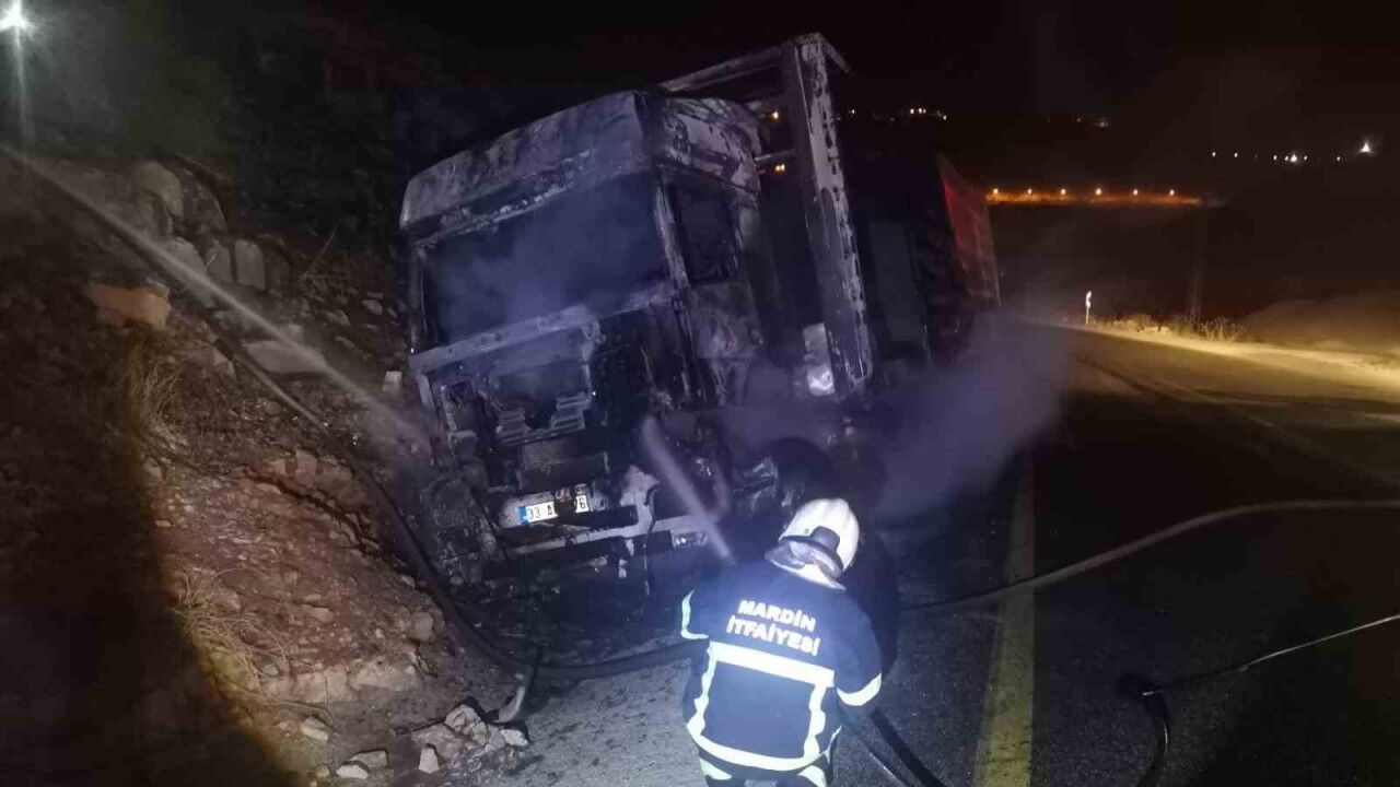 Mardin’in Artuklu ilçesinde alevlere teslim olan tır, kullanılamaz hale geldi.