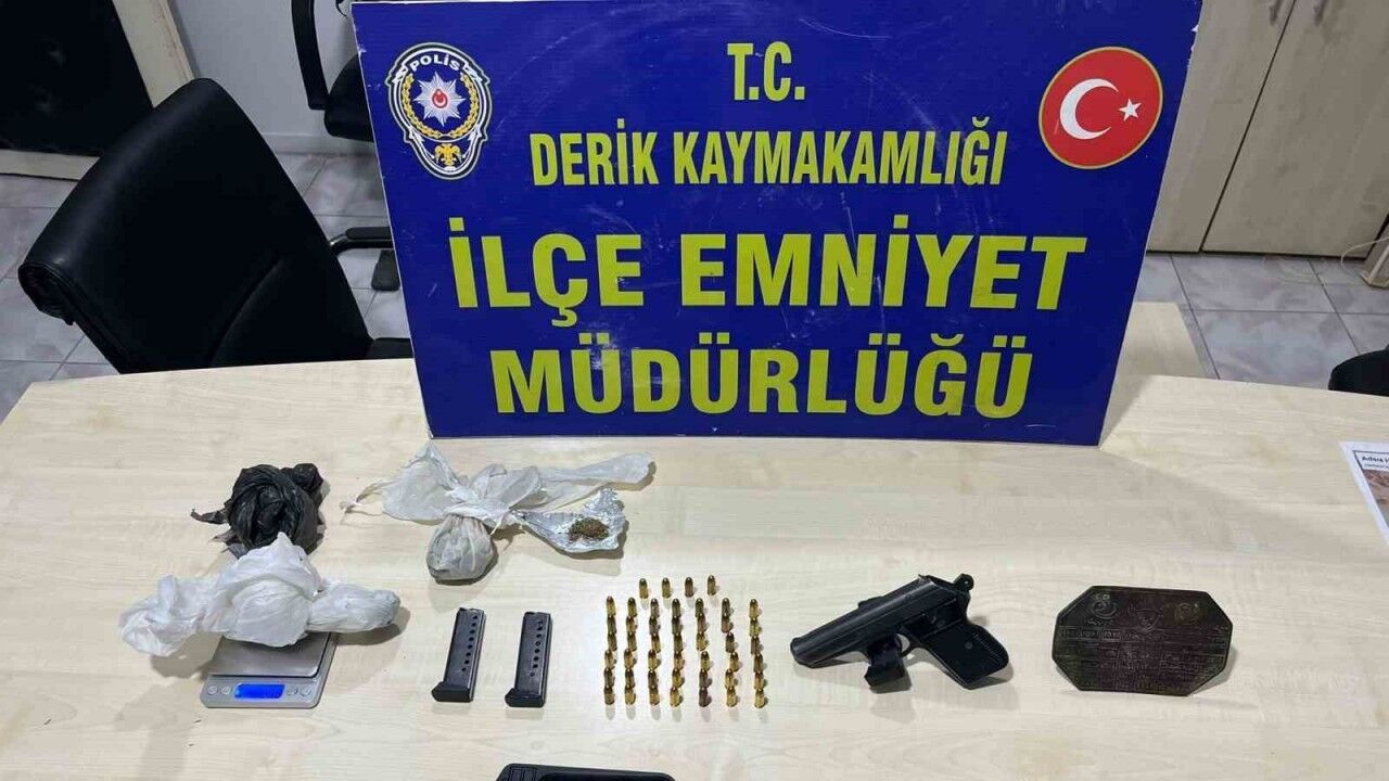Derik İlçe Emniyet Müdürlüğü ekiplerince, uyuşturucu madde ticareti ve kullanımının önlenmesine yönelik çalışma ilçedeki iki adrese operasyon yapıldı. Yapılan aramalarda, 21 kök Hint keneviri, 65,4 gram esrar, 1 adet ruhsatsız pompalı tüfek, 1 adet ruhsatsız tabanca, 3 tabanca şarjörü, 46 adet tabanca fişeği ve tarihi eser niteliğinde 1 obje ele geçirildi. Olayla ilgili gözaltına alınan 2 şüpheli hakkında adli işlem başlatıldı.