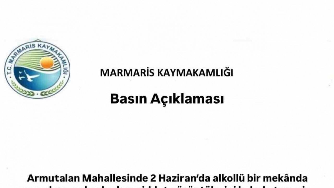 Marmaris Kaymakamlığı’ndan yapılan açıklamada şu ifadelere yer verildi: "Armutalan Mahallesi’nde 2 Haziran’da alkollü bir mekanda meydana gelen kadına şiddet görüntülerini kabul etmemiz asla mümkün değildir. Bilinmelidir ki, Muğla’da kadına yönelik şiddete asla müsamaha gösterilmemektedir. Kadına yönelik her türlü şiddet davranışının karşısında, devletimizin kararlı duruşu vardır. Söz konusu olaya karıştığı tespit edilen 5 şahıs yakalanarak adli makamlara teslim edilmiştir. İşletme ve çalışanlarla ilgili adli ve idari soruşturma titizlikle sürdürülmekte olup, gelişmeler tüm yönleriyle yakından takip edilmektedir."