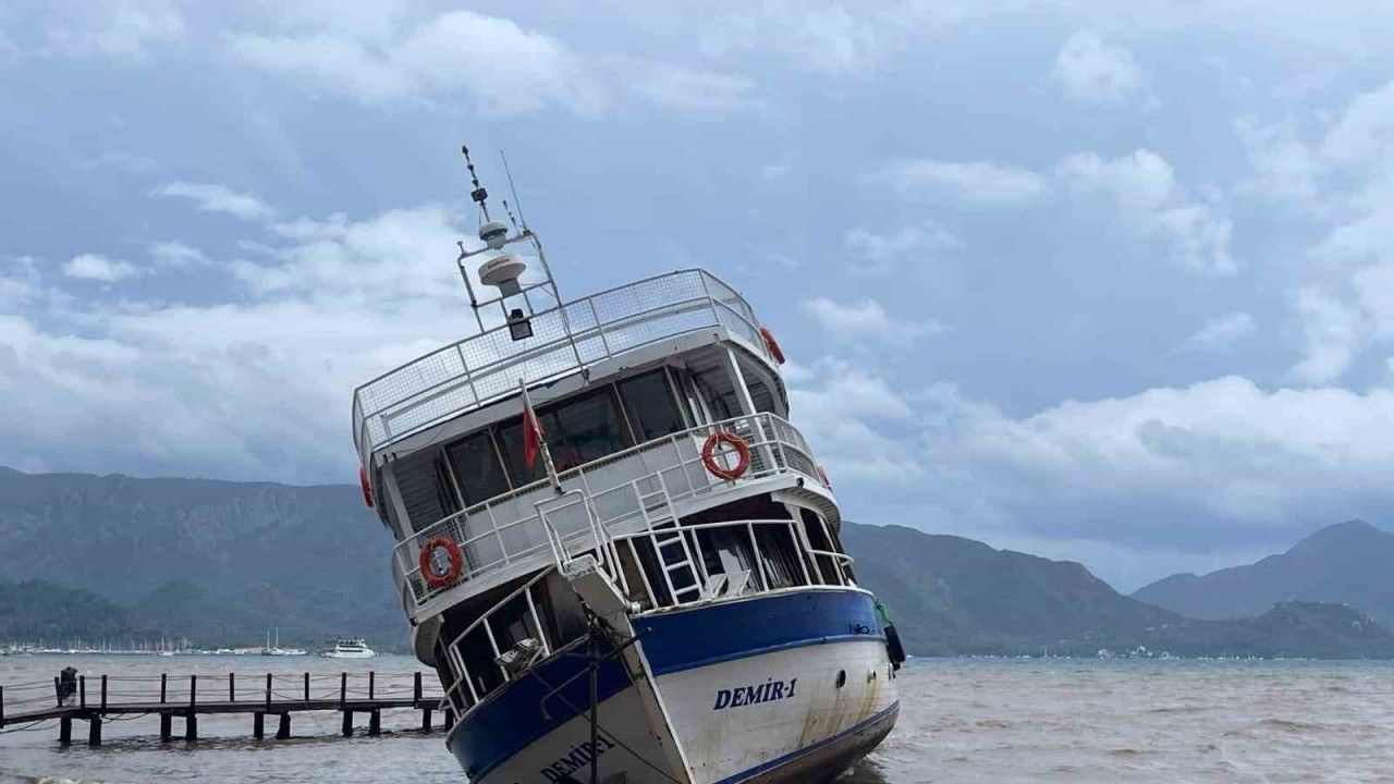 Muğla’nın Marmaris ilçesinde etkili olan sağanak yağış ve fırtına sebebiyle iskeleye çarpan bir gezi teknesi karaya otururken sabah saatlerinden bu yana karaya oturan tekne sayısı 4’e yükseldi.