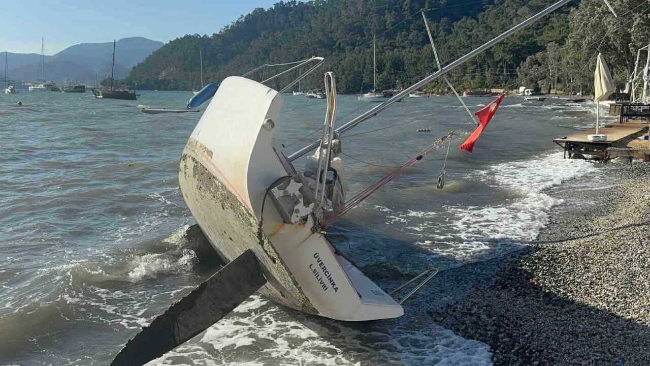 Muğla’nın Marmaris ilçesi Aktaş mevkiinde etkili olan şiddetli rüzgâr ve fırtına nedeniyle bir tekne kıyıya sürüklenerek karaya oturdu.