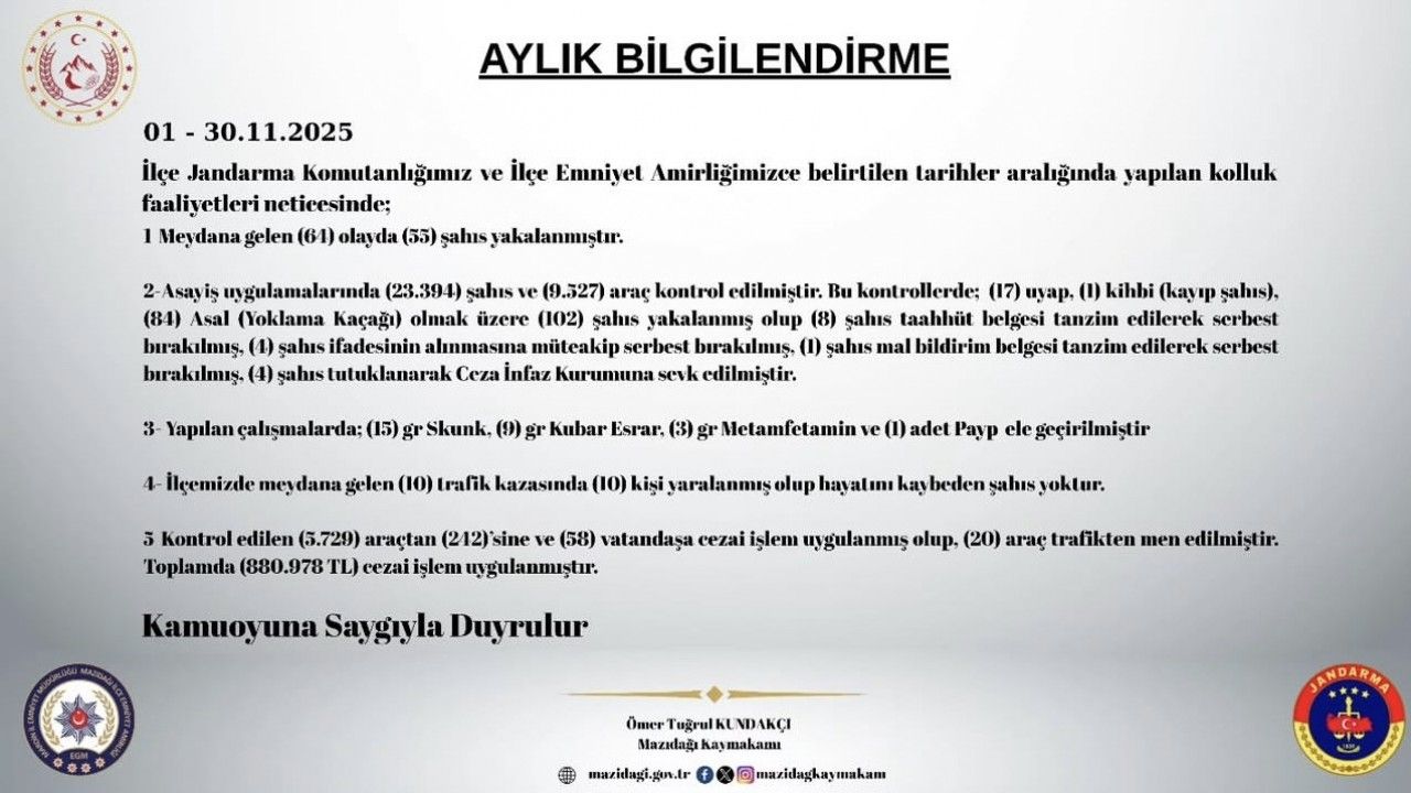 Mardin’in Mazıdağı ilçesinde Kaymakamlık, Kasım 2025 dönemi güvenlik faaliyet raporunu kamuoyuyla paylaştı. İlçe Jandarma Komutanlığı ve İlçe Emniyet Amirliği’nin 1-30 Kasım tarihleri arasındaki çalışmaları neticesinde, bir ayda 23 binden fazla kişi sorgulandı, aranan 102 şahıs yakalandı.