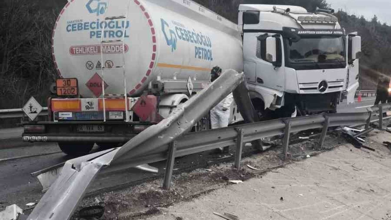 Bilecik'te kontrolden çıkan mazot yüklü tanker karşı şeride geçerken faciadan dönüldü.