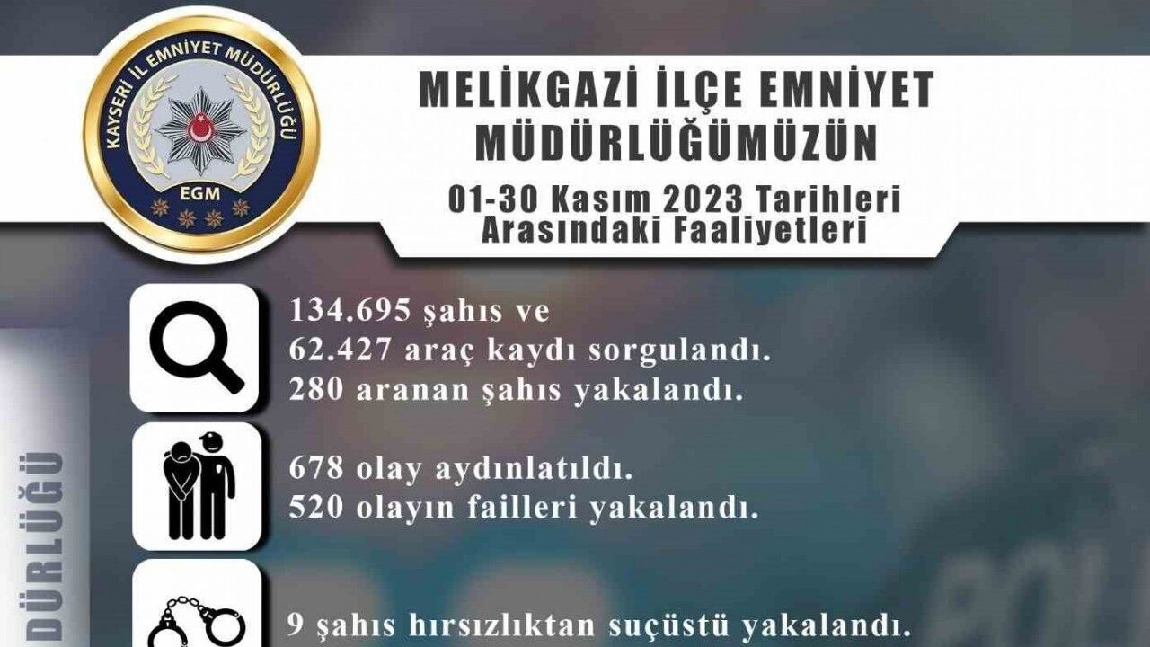 Edinilen bilgiye göre Melikgazi İlçe Emniyet Müdürlüğü ekiplerince 1 - 30 Kasım tarihleri arasında yapılan çalışmalarda 134 bin 695 şahıs ve 62 bin 427 araç kaydı sorgulandı. Sorgulamalar sonucunda 280 aranan şahıs yakalanırken 114 aranan araç alındı, 39 yakalama hacizli oto ile 10 çalıntı oto-motosiklet yakalandı. Ekiplerce 678 olay aydınlatılırken 520 olayın failleri de yakalandı. Yine ekiplerce yapılan çalışmalarda 9 şahıs hırsızlıktan suçüstü yakalandı, 91 kayıp şahıs bulunarak ailesine teslim edildi ve 67 şahsa da bakaya işlemi yapıldı.