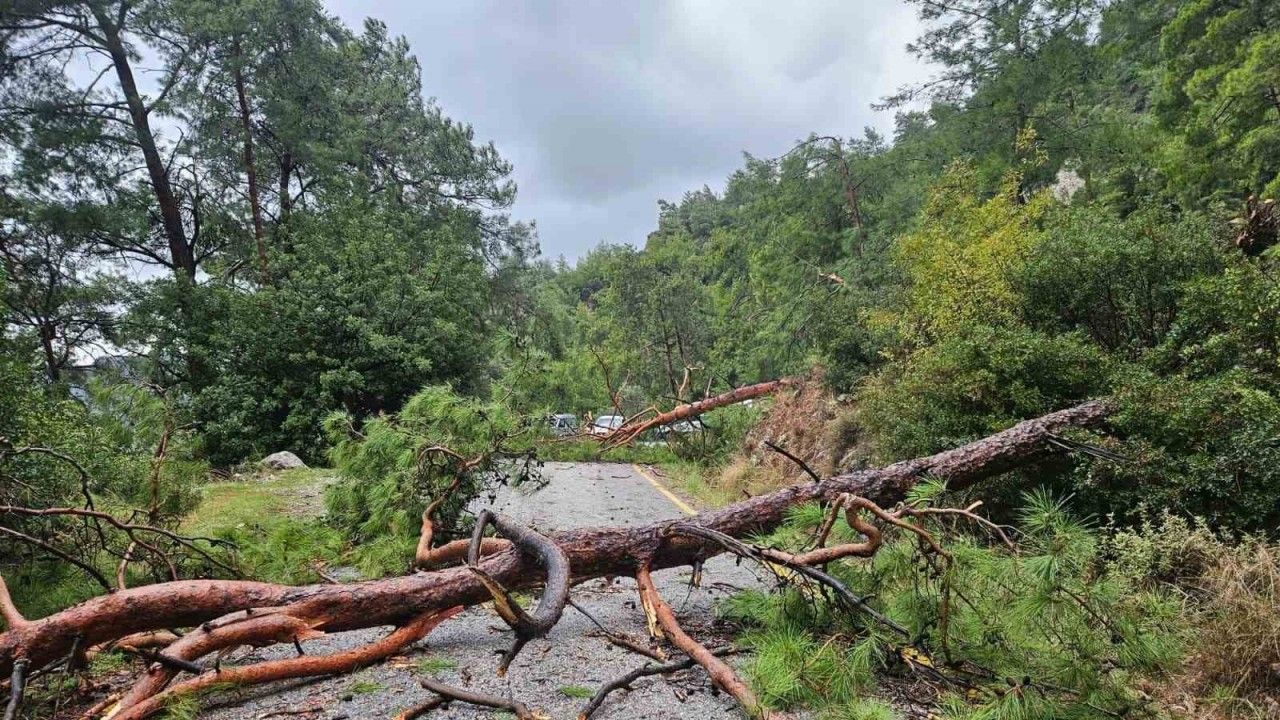 Muğla’nın turistik Menteşe ilçesine bağlı Sarnıç Mahallesi Akbük Mevkii yolunda etkili olan şiddetli yağış ve fırtına, ulaşımı felç etti. Kuvvetli rüzgarın etkisiyle 3 büyük çam ağacı yola devrildi.