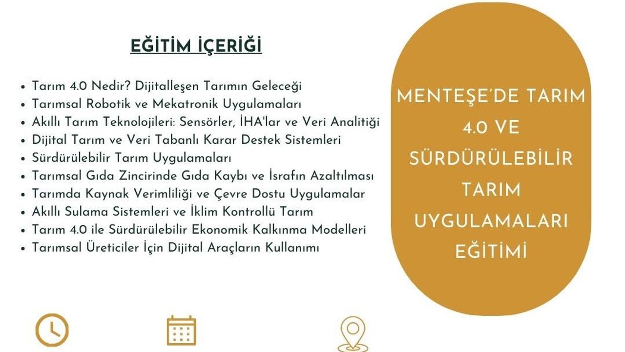 Menteşe Belediyesi tarafından yürütülen ve Muğla Büyükşehir Belediyesi ile Menteşe Ziraat Odası ortaklığında gerçekleştirilecek olan "Menteşe’de Tarım 4.0 ve Sürdürülebilir Tarım Uygulamaları" eğitimi, Güney Ege Kalkınma Ajansı (GEKA) Teknik Destek Programı kapsamında 21 Nisan 2025 Pazartesi günü başlıyor. Eğitimler, Konakaltı İskender Alper Kültür Merkezi’nde iki gün boyunca sürecek.