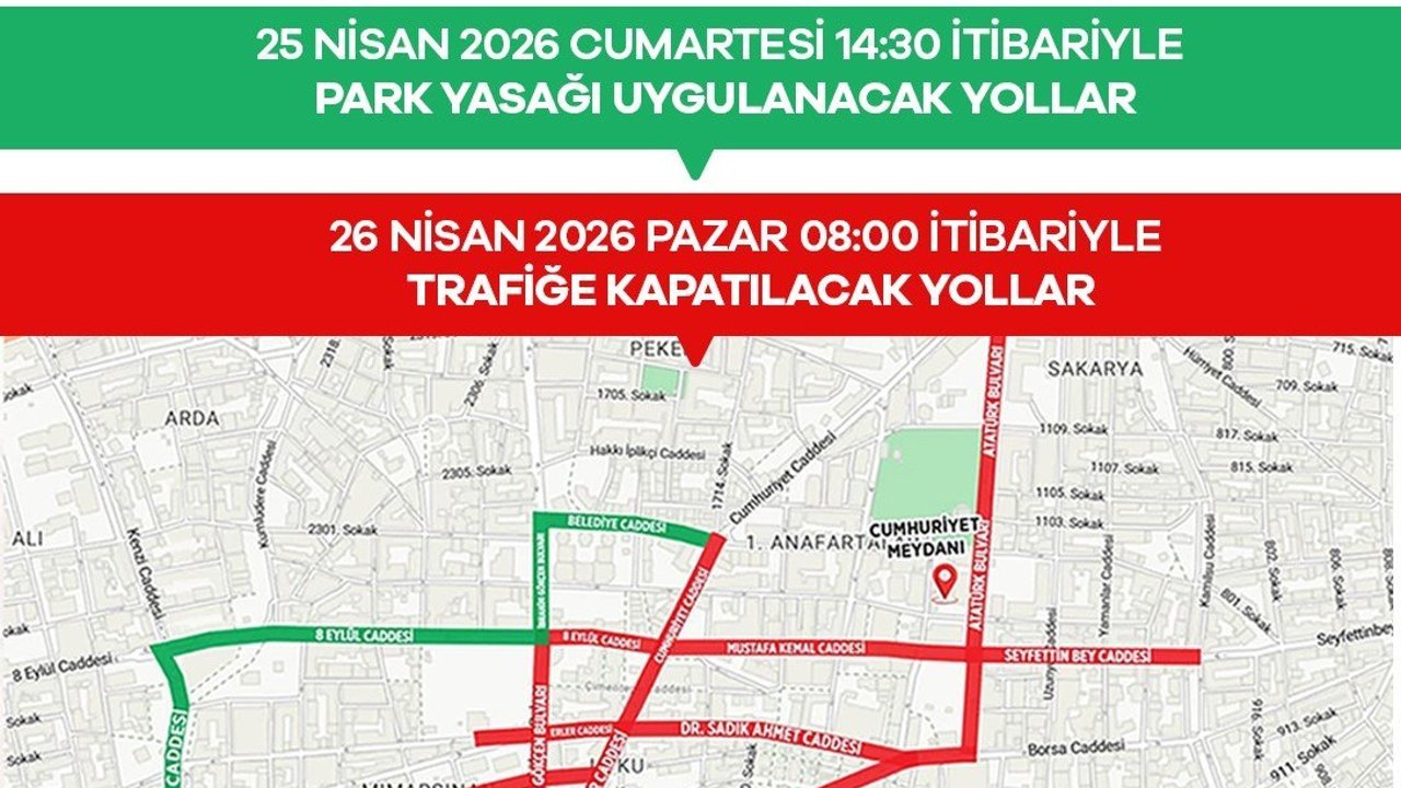 Cumhuriyet Meydanı'na çıkan yollar ile birlikte, Atatürk Bulvarı üzeri (Cumhuriyet Caddesi ile Mustafa Kemal Paşa Caddesi arası), Sultan Camii önüne çıkan yollar, Valilik önüne çıkan yollar, Seyfettin Bey Caddesi üzeri (Kamilsu Caddesi ile Atatürk Bulvarı arası), Mustafa Kemal Paşa Caddesi üzeri (Atatürk Bulvarı ile Cumhuriyet Caddesi arası), 8 Eylül Caddesi üzeri (Cumhuriyet Caddesi ile İbrahim Gökçen Bulvarı arası), İzmir Caddesi üzeri (Mustafa Kemal Paşa Caddesi ile Murat Caddesi arası), 2507 Sokak üzeri (2500 Sokak ile İzmir Caddesi arası), 2505 Sokak üzeri (2501 Sokak ile İzmir Caddesi arası), Çarşı Bulvarı üzeri (İzmir Caddesi ile Dr. Sadık Ahmet Caddesi arası),Murat Caddesi üzeri (1800 Sokak ile İbrahim Gökçen Bulvarı arası), İbrahim Gökçen Bulvarı üzeri (8 Eylül Caddesi ile İzmir Caddesi arası) olan yollar trafiğe kapatılacak.