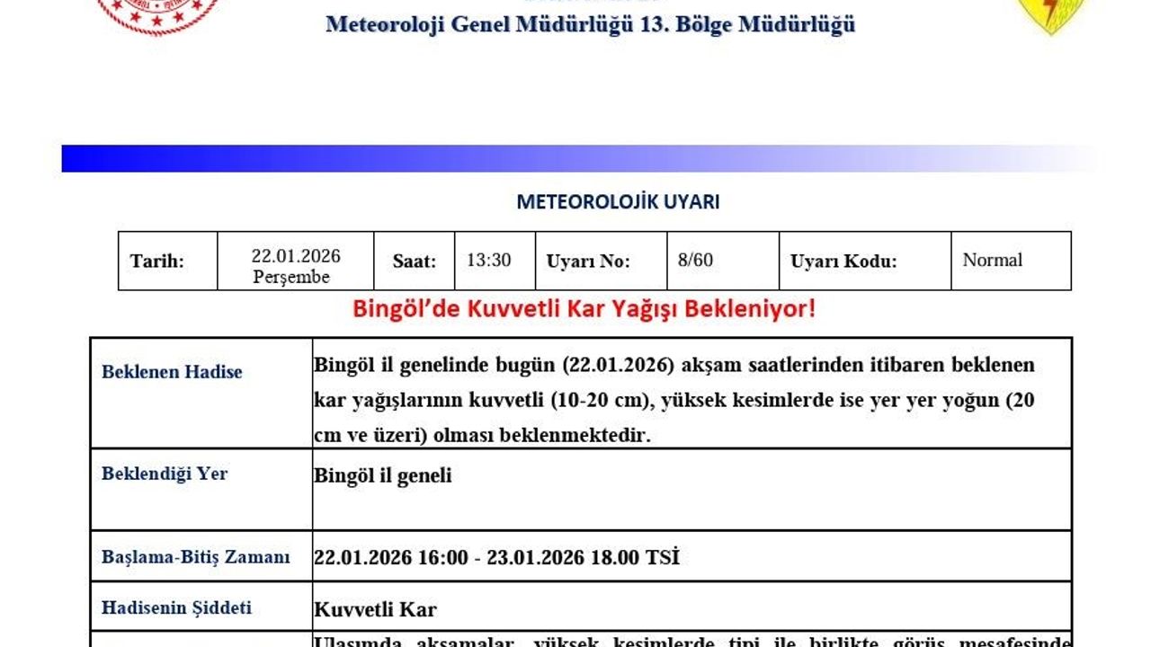 Meteoroloji 13. Bölge Müdürlüğü tarafından yapılan açıklamada, 'Bingöl il genelinde bugün (22.01.2026) akşam saatlerinden itibaren beklenen kar yağışlarının kuvvetli (10-20 cm), yüksek kesimlerde ise yer yer yoğun (20 cm ve üzeri) olması ve yağışın 23.01.2026 saat 18.00'a kadar süreceği beklenmektedir. Ulaşımda aksamalar, yüksek kesimlerde tipi ile birlikte görüş mesafesinde azalma, buzlanma ve don olayı, yüksek kar örtüsüne sahip eğimli bölgelerde çığ gibi olumsuzluklara karşı dikkatli ve tedbirli olunmalıdır' ifadelerine yer verildi.