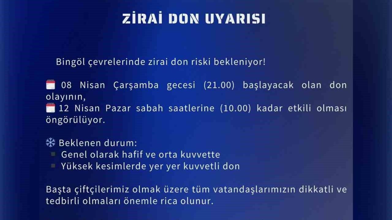 Meteoroloji 13. Bölge Müdürlüğü'nden yapılan açıklamada, 'Bingöl çevrelerinde zirai don riski bekleniyor. 08 Nisan Çarşamba gecesi (21.00) başlayacak olan don olayının, 12 Nisan Pazar sabah saatlerine (10.00) kadar etkili olması öngörülüyor. Başta çiftçilerimiz olmak üzere tüm vatandaşlarımızın dikkatli ve tedbirli olmaları önemle rica olunur. Tarımsal faaliyetlerle uğraşan vatandaşlarımızın önlemleri almaları büyük önem taşımaktadır' denildi.