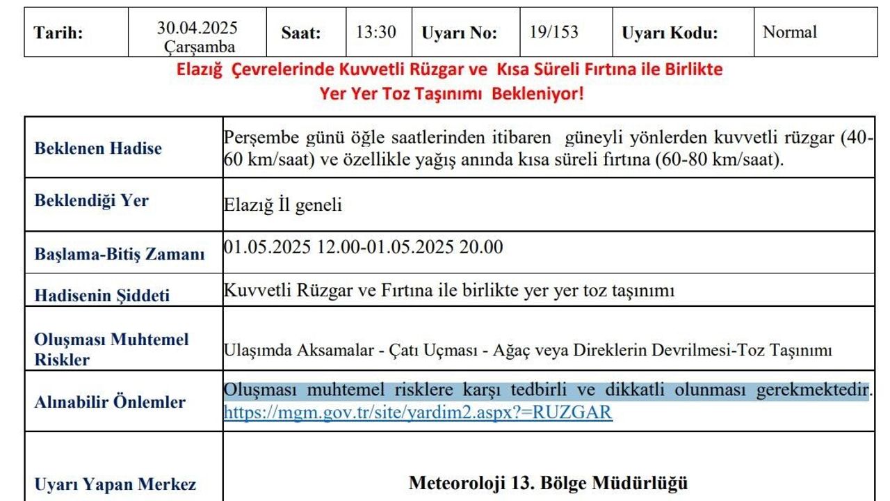 Meteoroloji 13. Bölge Müdürlüğü, Elazığ için kuvvetli rüzgar ve fırtına ile yer yer toz taşınımı uyarısı yaptı.