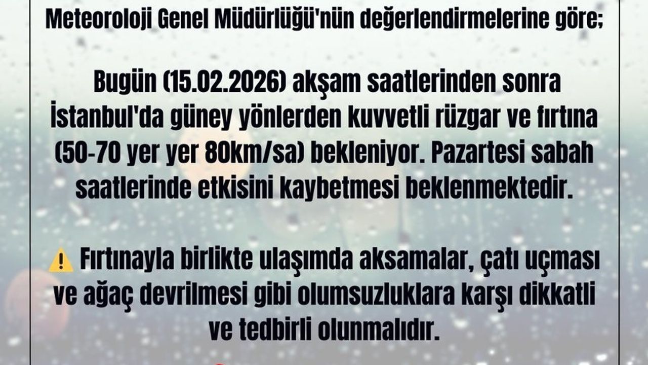 Meteoroloji Genel Müdürlüğü, İstanbul'da akşam saatlerinden itibaren güney yönlerden kuvvetli rüzgar ve fırtına beklendiğini duyurdu. İstanbul Valiliği'nin sosyal medya hesabından yapılan paylaşımda, çatı uçması gibi olaylara karşı vatandaşların dikkatli olmaları istendi.