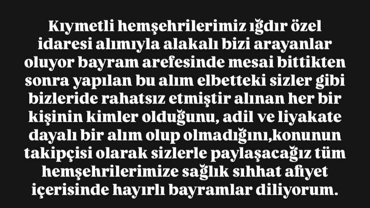 İl Başkanlığına gelen çok sayıda şikayet üzerine açıklama yapan MHP Iğdır İl Başkanı, "Kıymetli hemşerilerimiz Iğdır Özel İdaresi alımıyla alakalı bizi arayanlar oluyor. Bayram arifesinde mesai bittikten sonra yapılan bu alım elbette ki sizler gibi bizleri de rahatsız etmiştir. Alınan her bir kişinin kimler olduğunu, adil ve liyakate dayalı bir alım olup olmadığını, konunun takipçisi olarak sizlerle paylaşacağız tüm hemşerilerimize sağlık sıhhat afiyet içerisinde hayırlı bayramlar diliyorum" dedi. Tepkiler üzerine İl Özel İdaresi alım sürecinin İŞKUR üzerinde devam ettiğini; "İl Özel İdaremiz Personel Limited Şirketi bünyesinde, 12 farklı iş kolunda istihdam edilmek üzere 40 kişilik işçi alımına ilişkin süreç başlatılmıştır. Söz konusu süreç, İŞKUR üzerinden ilan edilmiş olup, başvurular İl Özel İdaremiz tarafından alınmaktadır. Başvuru süreci devam etmekte olup an itibarıyla başvuru yapan kişi sayısı 258’e ulaşmıştır. Başvuruların tamamlanmasının ardından, şartları taşıyan adaylara belirlenecek tarihte yazılı sınav ve akabinde sözlü sınav uygulanacaktır. Sınavlarda adaylardan başarılı olanlar, kamuoyuyla paylaşılacak nihai asil listede ilan edilecektir.