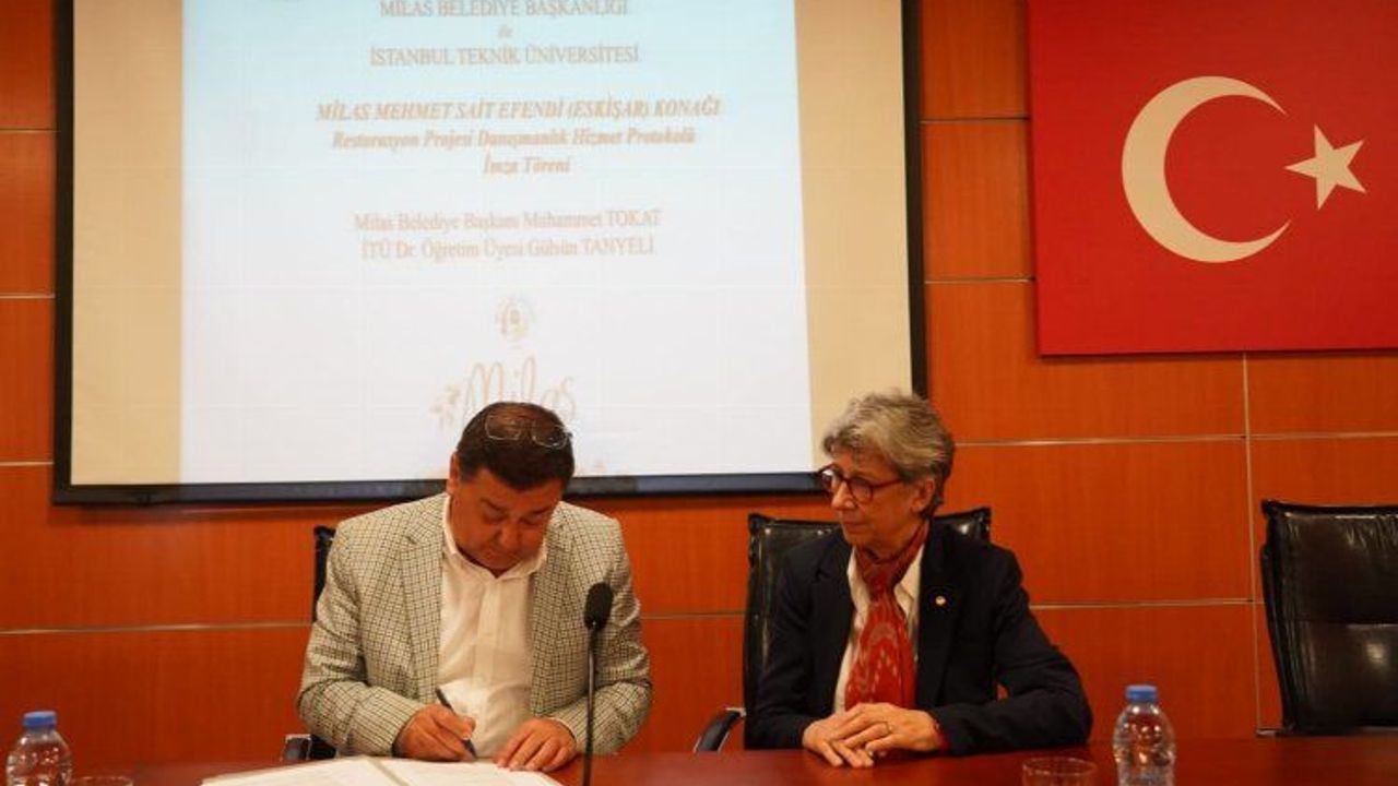 MİTSO Toplantı Salonu’nda düzenlenen panel öncesinde Milas Belediyesi ve İstanbul Teknik Üniversitesi arasında İTÜ Dr. Öğretim Üyesi Gülsün Tanyeli'nin katılımıyla Milas Mehmet Sait Efendi (Eskişar Konağı) Restorasyon Projesi Danışmanlık Hizmet Protokolü İmza Töreni gerçekleştirildi.