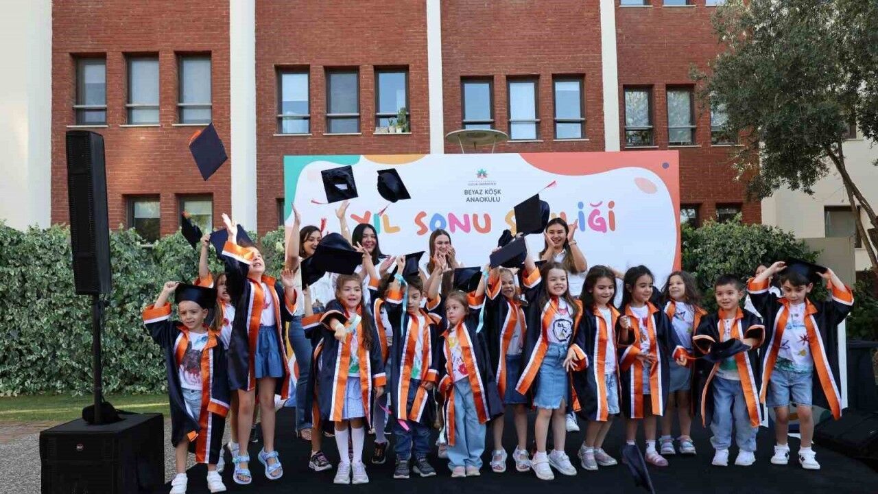 İzmir’in vakıf üniversitesine ait tek anaokulu olan İzmir Ekonomi Üniversitesi (İEÜ) Beyaz Köşk Anaokulu’nda yıl sonu şenliği ve mezuniyet coşkusu yaşandı. 5-6 yaş grubundaki 19 çocuk, hayatlarının ilk mezuniyet heyecanını yaşarken, tıpkı üniversiteli ağabey ve ablaları gibi cübbelerini giyip keplerini havaya attı.