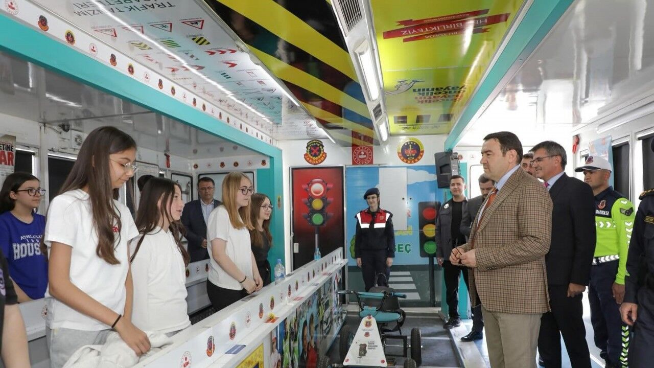 Kütahya Valisi Musa Işın, İçişleri Bakanlığı ile Milli Eğitim Bakanlığı iş birliğinde yürütülen trafik bilincini artırma projesi kapsamında şehre gelen "Mobil Trafik Eğitim Tırı"nı ziyaret etti.