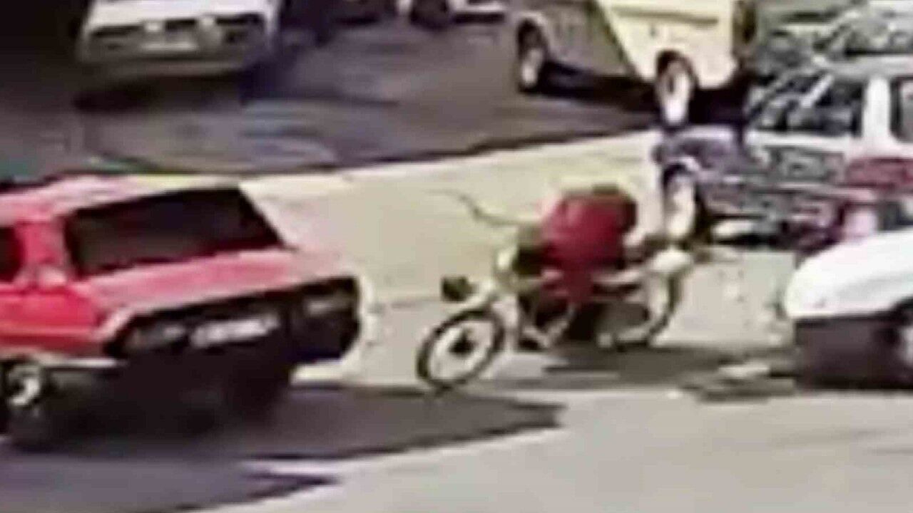 Öte yandan, kaza anı bir iş yerinin güvenlik kamerasına yansırken, görüntülerde motosikletin araca çarpmamak için manevra yaptığı ve park halindeki otomobile çarptığı görülüyor.