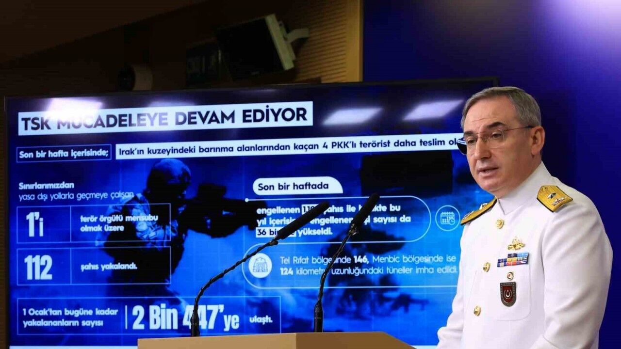 Türk Silahlı Kuvvetlerinin devam eden operasyon, arama-tarama ve sınır güvenliği faaliyetlerinin devam ettiğini belirten Tuğamiral Aktürk, "Son bir hafta içerisinde, Irak’ın kuzeyindeki barınma alanlarından kaçan 4 PKK’lı terörist daha teslim olmuş, sınırlarımızdan yasa dışı yollarla geçmeye çalışan 1’i terör örgütü mensubu olmak üzere 112 şahıs yakalanmış, 1 Ocak’tan bugüne kadar yasa dışı yollarla geçmeye çalışırken yakalananların sayısı 2 bin 447’ye, son bir haftada engellenen bin 192 şahıs ile birlikte bu yıl içerisinde engellenen kişi sayısı da 36 bin 3’e ulaşmıştır. Suriye Harekât Alanlarında ise 8 Ocak’tan bu yana sürdürülen ‘tünel imha’ faaliyetleri kapsamında bugüne kadar Tel Rıfat bölgesinde 146, Menbic bölgesinde ise 124 kilometre uzunluğundaki tüneller imha edilmiştir" ifadelerini kullandı.