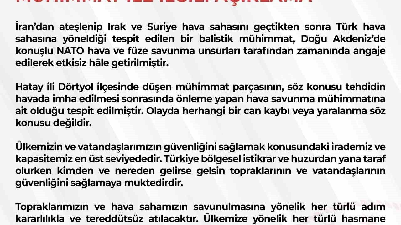 'İran'dan ateşlenip Irak ve Suriye hava sahasını geçtikten sonra Türk hava sahasına yöneldiği tespit edilen bir balistik mühimmat, Doğu Akdeniz'de konuşlu NATO hava ve füze savunma unsurları tarafından zamanında angaje edilerek etkisiz hâle getirilmiştir. Hatay ili Dörtyol ilçesinde düşen mühimmat parçasının, söz konusu tehdidin havada imha edilmesi sonrasında önleme yapan hava savunma mühimmatına ait olduğu tespit edilmiştir. Olayda herhangi bir can kaybı veya yaralanma söz konusu değildir. Ülkemizin ve vatandaşlarımızın güvenliğini sağlamak konusundaki irademiz ve kapasitemiz en üst seviyededir. Türkiye bölgesel istikrar ve huzurdan yana taraf olurken, kimden ve nereden gelirse gelsin topraklarının ve vatandaşlarının güvenliğini sağlamaya muktedirdir. Topraklarımızın ve hava sahamızın savunulmasına yönelik her türlü adım kararlılıkla ve tereddütsüz atılacaktır. Ülkemize yönelik her türlü hasmane tutuma karşı cevap verme hakkımızın mahfuz olduğunu hatırlatıyoruz. Tüm taraflara, çatışmaların bölgede daha da yayılmasına neden olacak adımlardan uzak durma uyarısında bulunuyoruz. Bu kapsamda NATO ve diğer müttefiklerimizle istişare içinde olmayı sürdüreceğiz.'